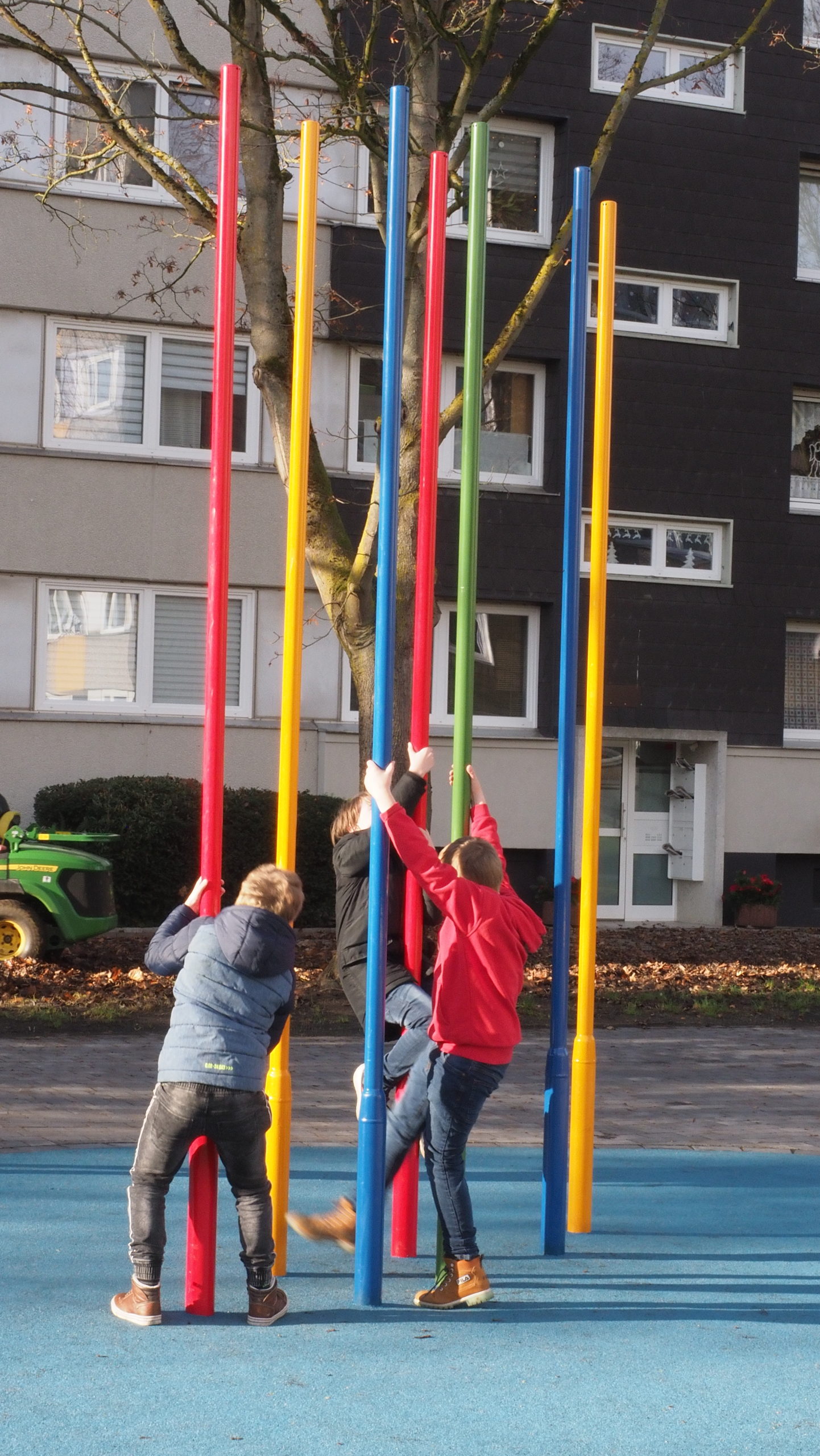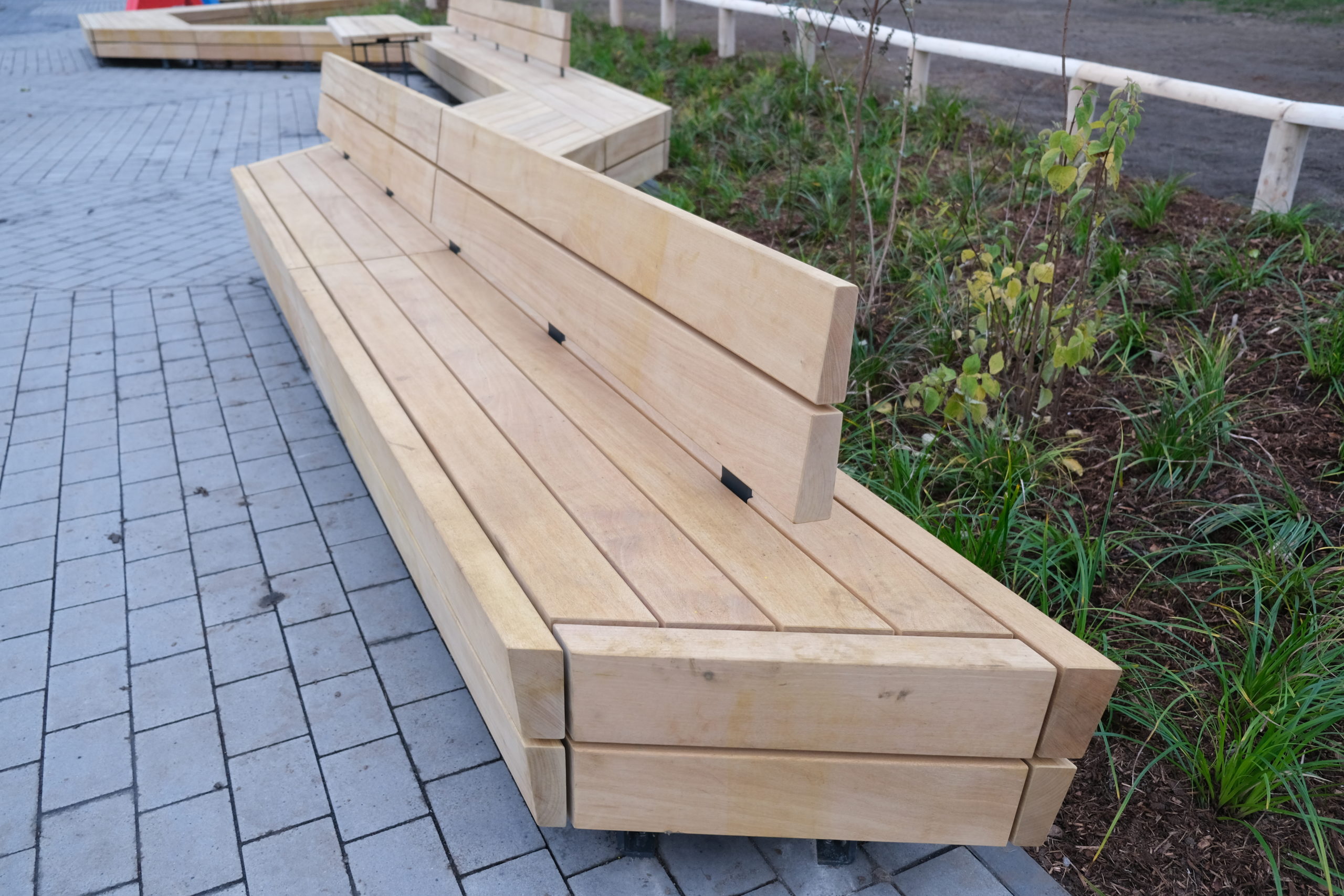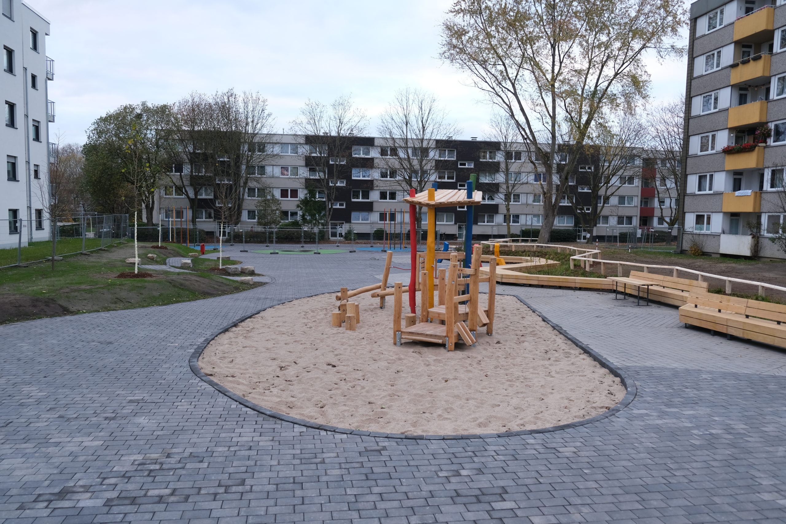 Der neue Quartiersplatz hat eine Ausdehnung von circa 65 x 25 m und ist damit etwa so groß wie ein olympisches Schwimmbecken. Klettermikado, Springspielbereich, Roller-Rennstrecke, Schachfeld, „Mensch-Ärgere-dich-nicht“, Spielfläche für Kleinkinder und am Rand ausreichend Sitzgelegenheiten – so gestaltet sich der neue Quartiersplatz zwischen Kieler und Potsdamer Straße in Königsborn. Diese Kombinationsfläche, die auch freie Flächen für Bewegungsmöglichkeiten abseits der Spielgeräte vorhält, verfügt über eine 60 Meter lange Holzbank – an zwei Stellen mit Tischen – an denen auf vorgezeichneten Flächen Schach oder Mühle gespielt werden kann. „Dieser Platz hat ein komplett neues Aussehen bekommen und soll nun zu einem Ort der Begegnung werden.“ Ein solcher Platz sei zudem ein wichtiges und positives Signal, nicht nur für das Leben im Quartier.